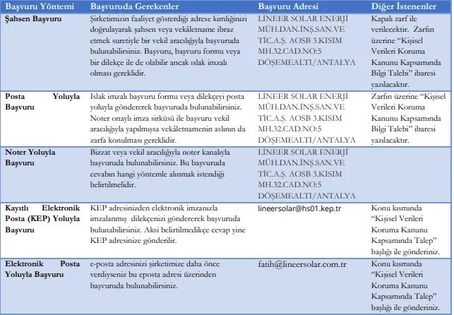 - Başvurunuzu açık, anlaşır bir şekilde ve kimlik ve adres bilgilerini tespit edici belgeleri de ekleyerek, yazılı ve ıslak imzalı olarak elden, yukarıda belirtilen şekillerde LİNEER (LİNEER SOLAR ENERJİ MÜH.DAN.İNŞ.SAN.VE TİC.A.Ş.) .’ ye ulaştırmanız gerekmektedir.